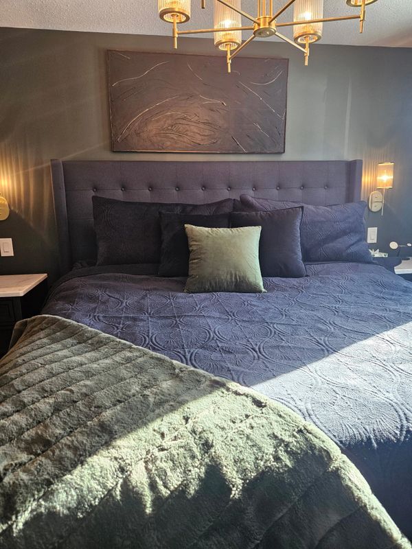 A bold feature wall introduces depth and character, while warm brass fixtures and updated lighting elevate the overall feel of the space. Each element was carefully selected to create a cohesive, layered design that feels refined and intentional.